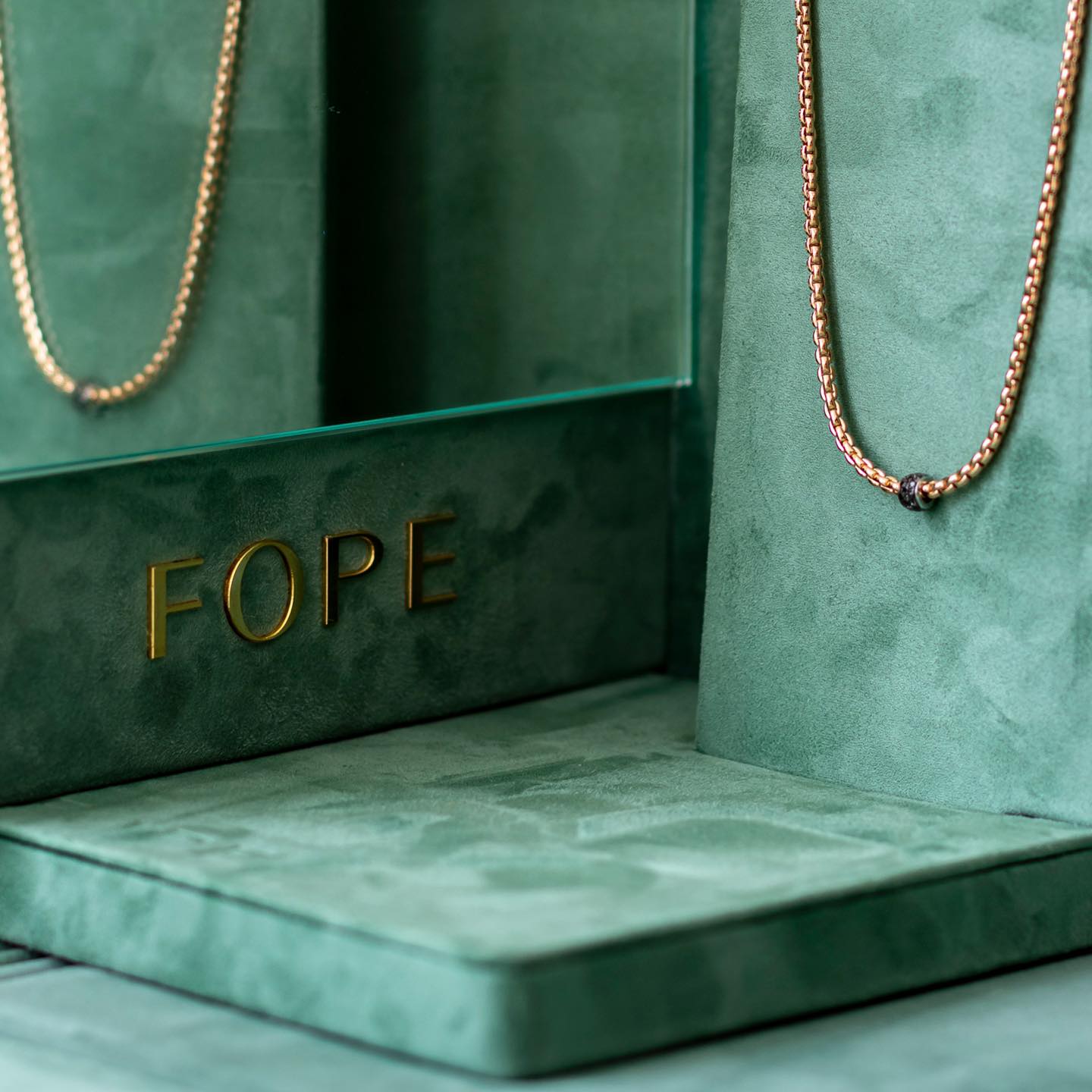 Each FOPE jewel is produced in Vicenza (Italy) by highly qualified craftsmen using cutting-edge technologies and controlled in accordance with the highest quality standards. The FOPE jewellery is made of 18 carat yellow, white or rose gold, with diamonds, precious or semi-precious stones, and natural pearls; FOPE and Flex’it are protected by trademarks.